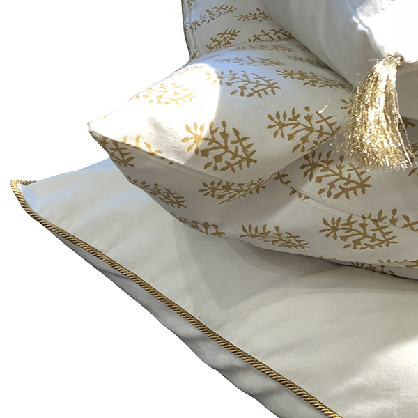 Delikat og vakker serie i enkel bomull med gull duskerStørrelse: 60×40 cmDenne puten har blitt laget av håndverkere som kan sitt fag gjennom generasjoner. Deres håndteknikk på farge trykk og broderi gjør hvert eneste produkt unikt ! Variasjon på farge og mønster eller størrelse må ikke sees på som ufullkommenhet – men som unikt. Vaskes på 30 grader. Må strekkes i våt tilstand.